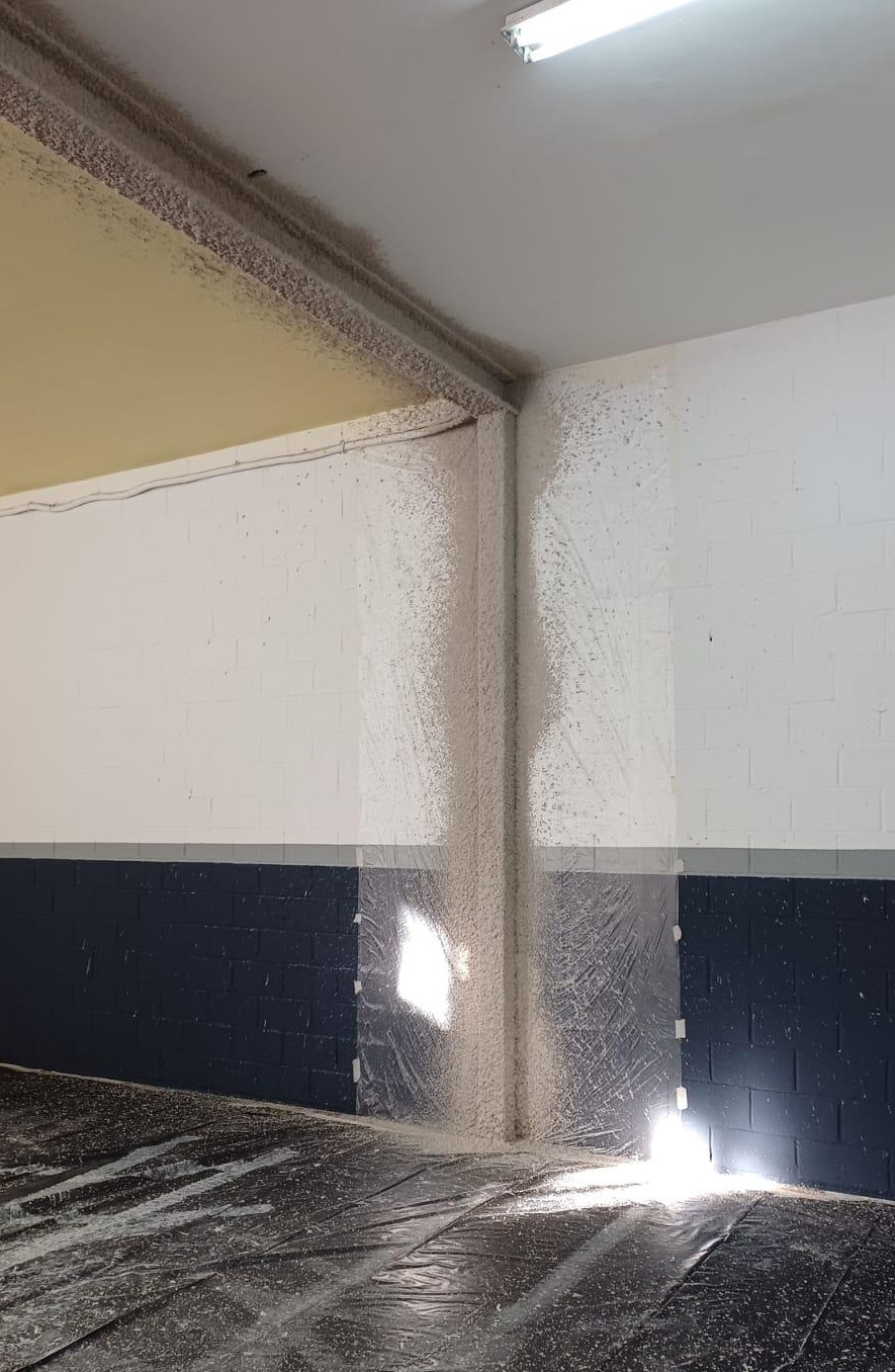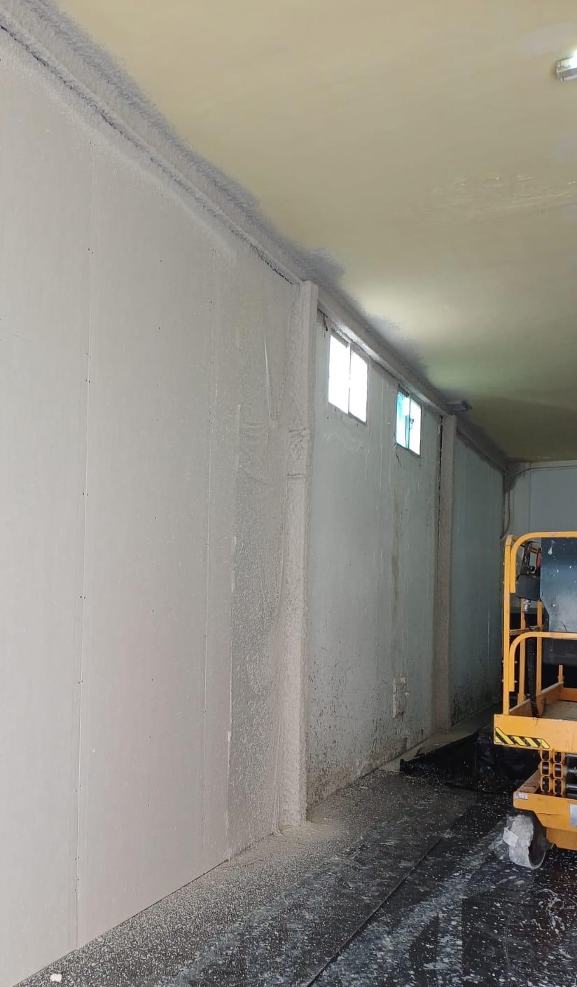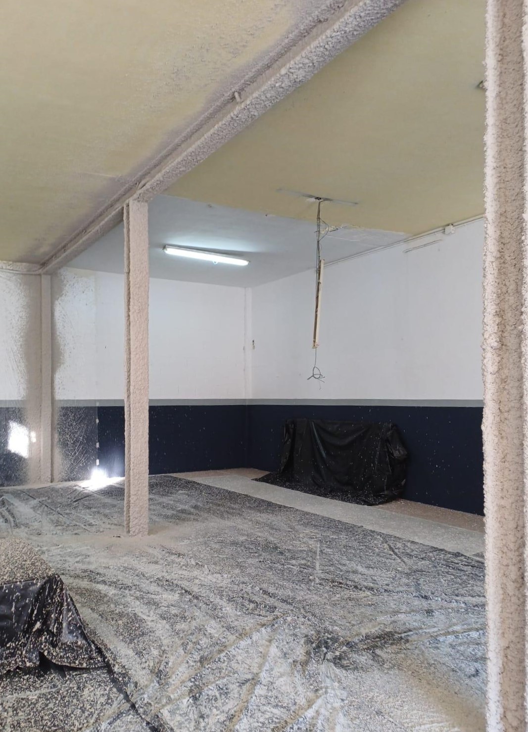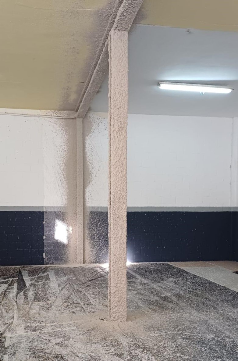 Ignifugado de  estructura metálica mediante proyectado de mortero de perlita y vermiculita, para conseguir una  protección al fuego de 90 minutos. Hay que tener en cuenta proteger bien suelos y paredes, porque al proyectar se emiten salpicaduras que pueden estropearlos.hashtag